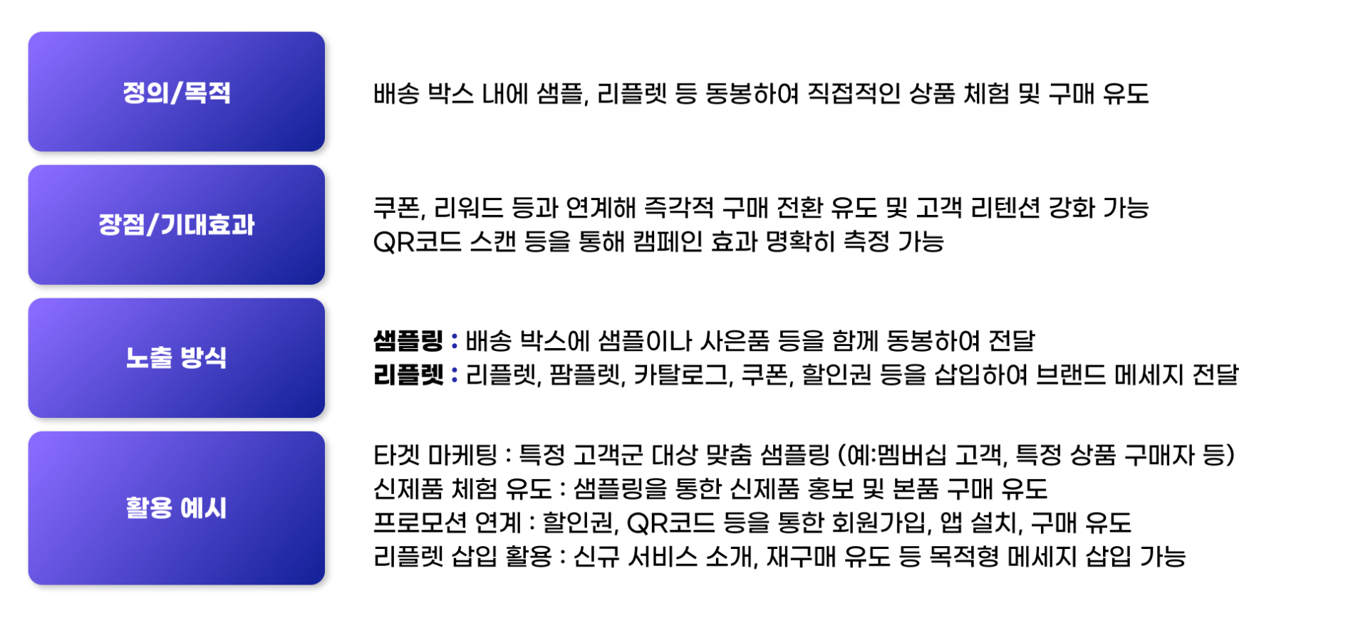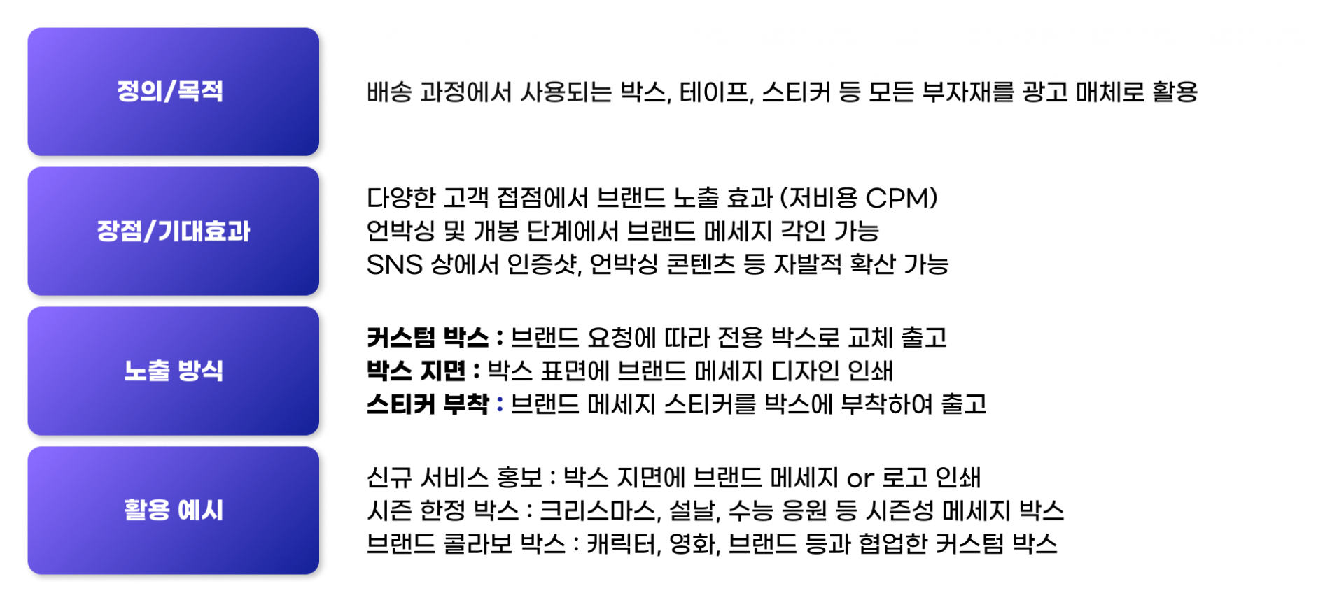 ▪︎ 배송 박스의 외부 브랜딩, 포장재, 박스 내부 동봉 샘플, 리플렛, 쿠폰 등 물리적인 형태 광고 포괄