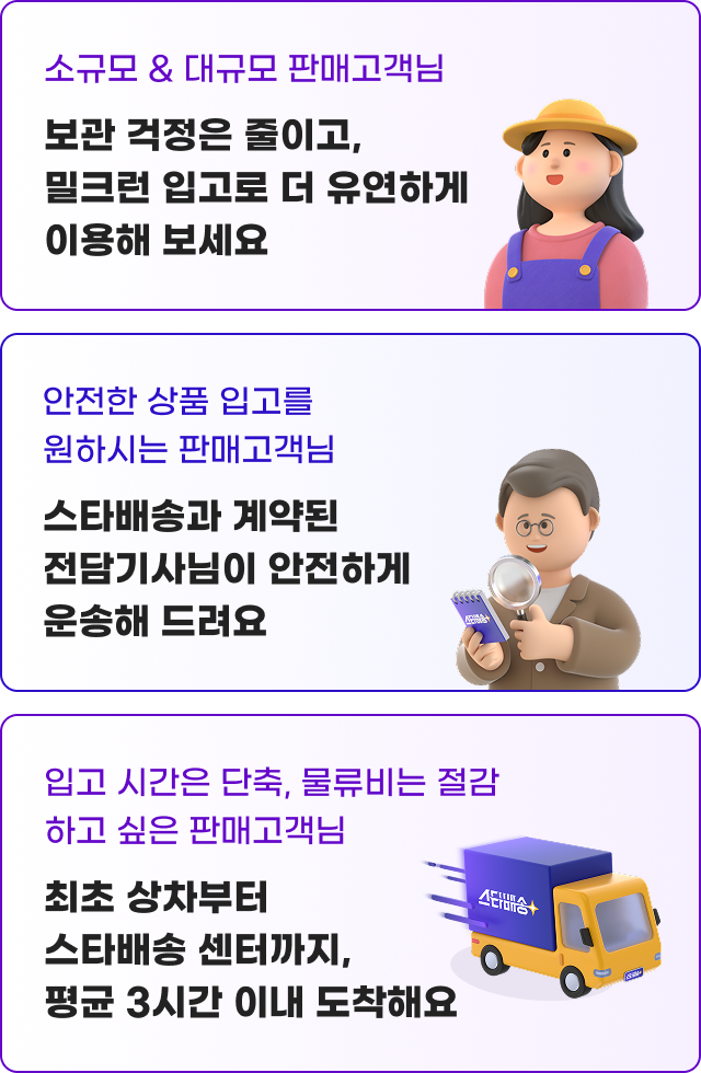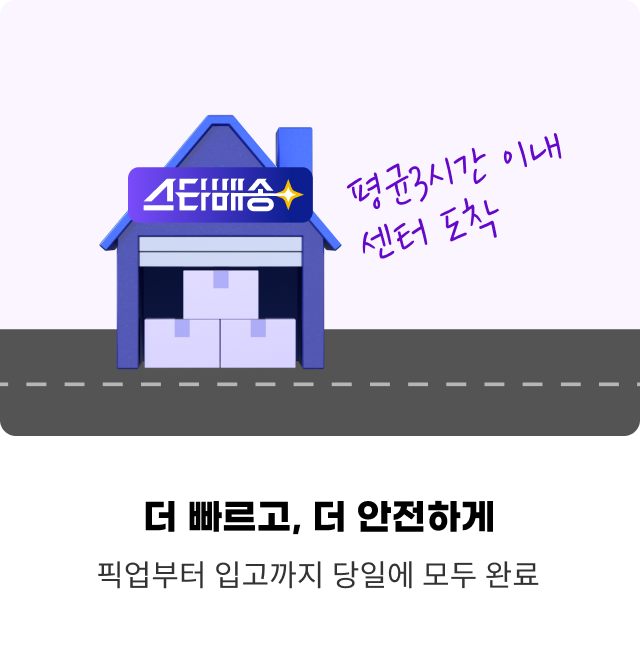 판매 고객님의 상품을 직접 픽업하여스타배송 풀필먼트 센터까지 안전하게 운송 및 당일 입고를 대행해요