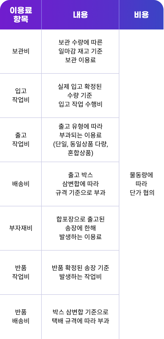 * 물동량 규모나 출고 방식, 작업 조건 등에 따라 이용 요금은 별도 협의 후 적용됩니다.
