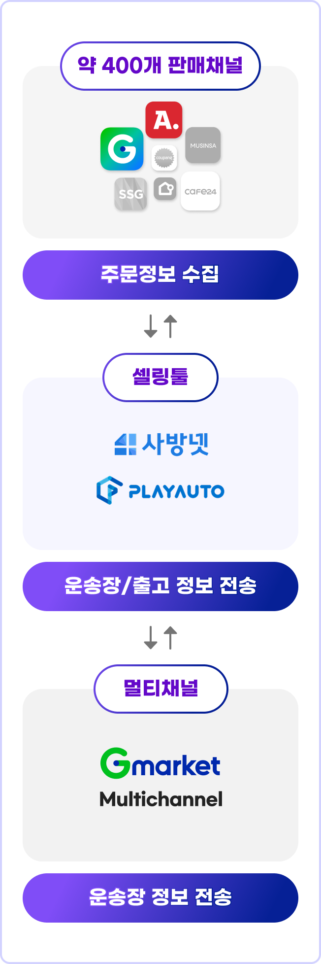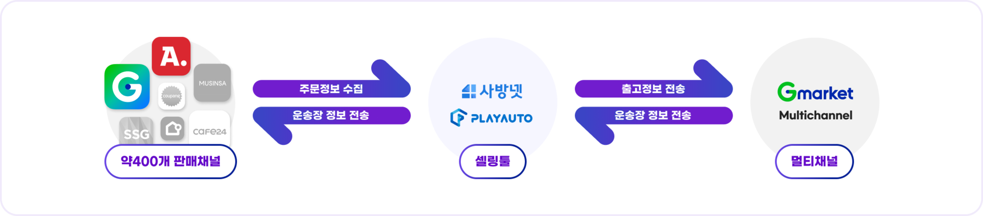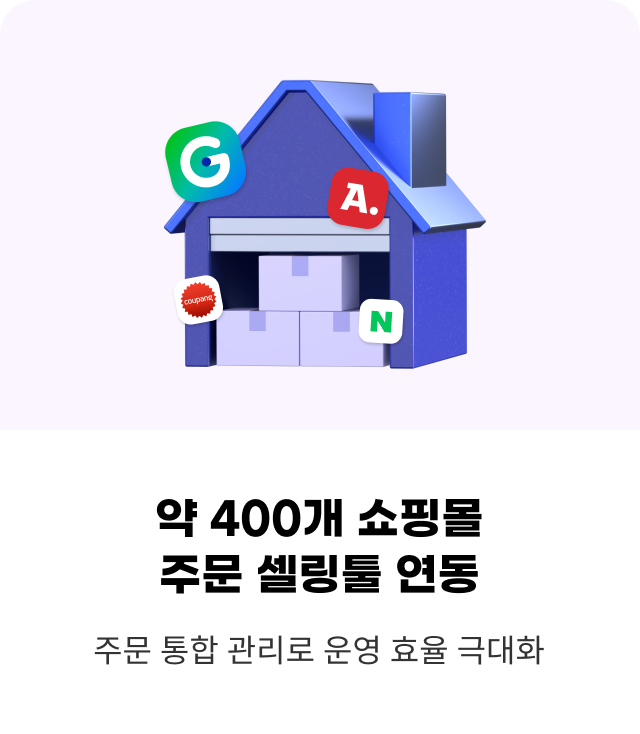 스타배송 뿐만 아니라 외부 판매채널 주문까지 동일한 품질로 출고할 수 있는 외부채널 특화 서비스로,판매 채널별 맞품형 출고와 400여개 쇼핑몰 주문 자동 연동이 가능해요