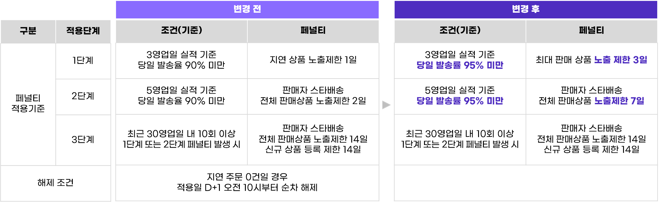 더욱 안정적이고 향상된 고객 경험을 제공하기 위해, 판매자 스타배송의 발송 지연 페널티 적용 기준이 변경되어 안내드립니다.아래 내용을 확인하시어 서비스 이용에 불편이 없으시길 바랍니다.
